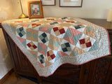 This pretty quilt has been made using simple patchwork blocks to create an eye-catching pattern that is constantly changing.  Our pattern is for a lap quilt size, but with some more fabric, you could create additional blocks to make your quilt even bigger.