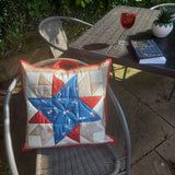 "Made using the beautiful ‘Spinning Star’ block, this book cushion has a secret! As well as the pocket on the back of the cushion to hold your favourite book, there is a hidden pocket inside.... perfect for your purse, phone and key, if you’re using it on the beach; or if you’re making it for a child, they can stow away their pyjamas for a sleepover. Topped with a handy handle, you can carry it along anywhere."