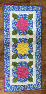 "A pretty flower block makes a beautiful runner that would look fabulous on your Springtime table. You could also make it longer, changing the colours to match your décor, for the end of the bed."