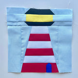 "The Light House block is a singular block that will sit in a row of beach huts. Intricate piecing creates this fun lighthouse, depicting visits to the seaside in the summer."