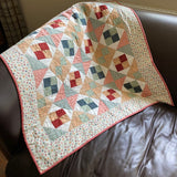 This pretty quilt has been made using simple patchwork blocks to create an eye-catching pattern that is constantly changing.  Our pattern is for a lap quilt size, but with some more fabric, you could create additional blocks to make your quilt even bigger.