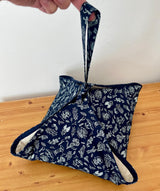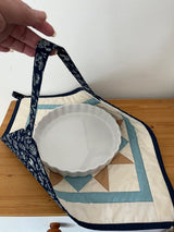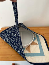 "The Pie Dish Carrier is an ideal way to take a pie to a neighbour's barbeque or a family gathering; it keeps the pie level as you carry it, then makes an eye-catching placemat when you open it out.