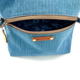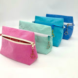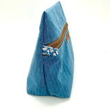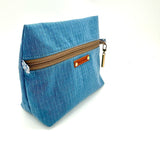 "This pouch was designed to show off the simple, elegant beauty of a new range of yarn dyed 100% cotton chambray woven fabrics that came in. Chambrays are produced with a dyed yarn and a white yarn, to create beautiful soft tones, making them the perfect compliment to your designer fabric stash - but also glorious in their own right! This make "sits up" so that the pouch (and the fabric) can be admired." - Natasha